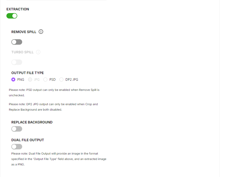 Extraction w/ Turbo Spill- for images with severe color spill. Not intended to be used as a default as there are side effects that can occur when used across a large job.