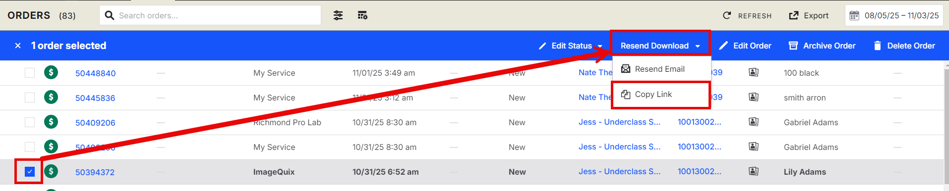 If the customer has entered the wrong email address: You can copy the link and send the link directly to them by going to the jobs orders tab and clicking Copy Download Link.