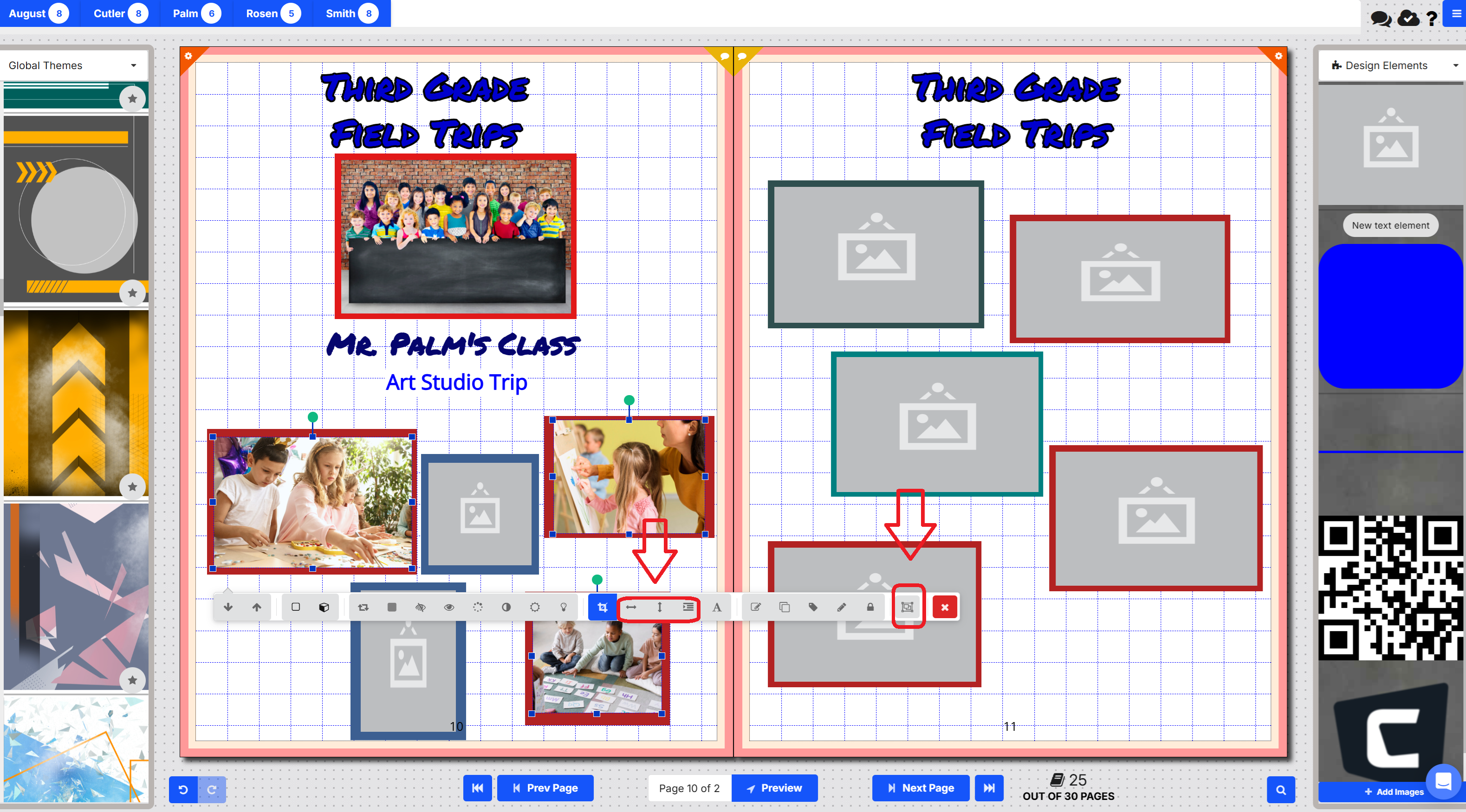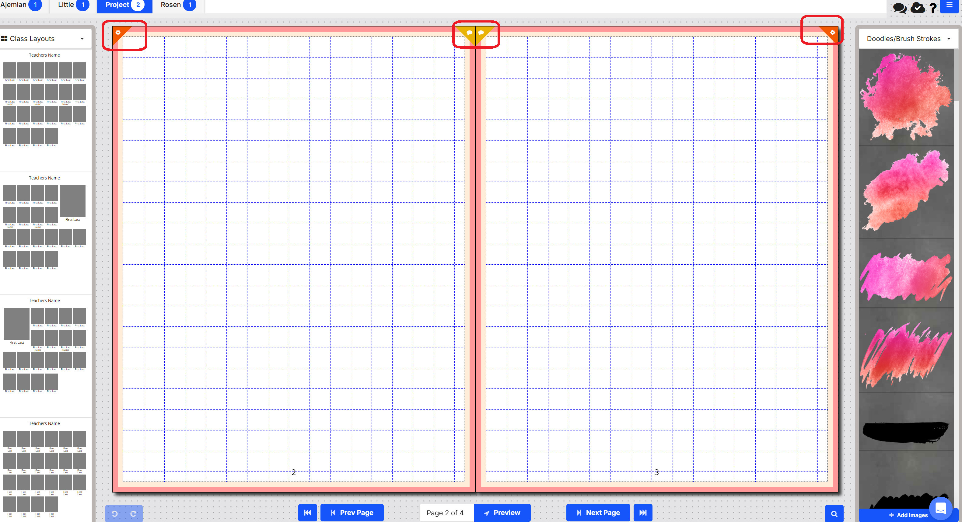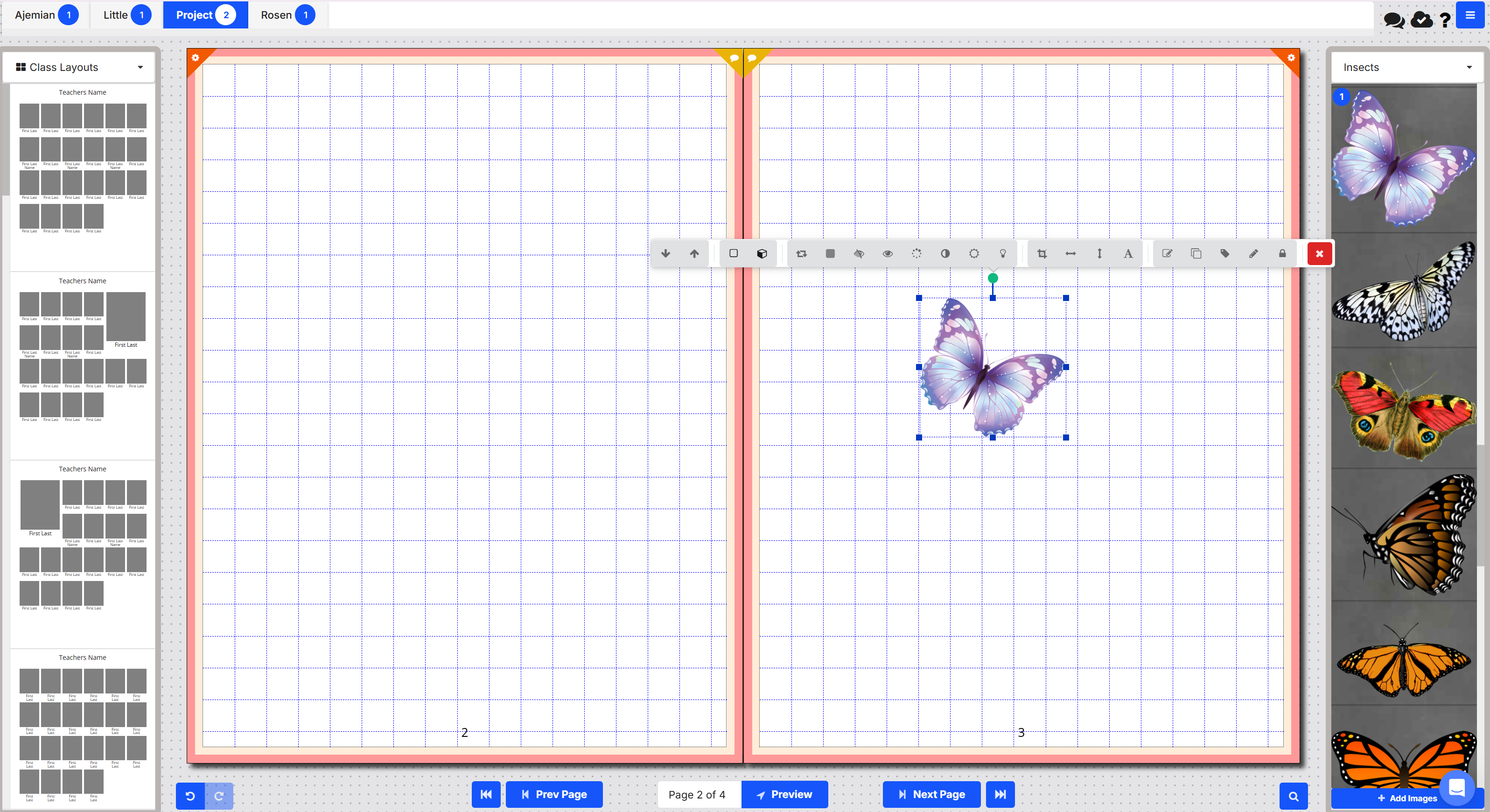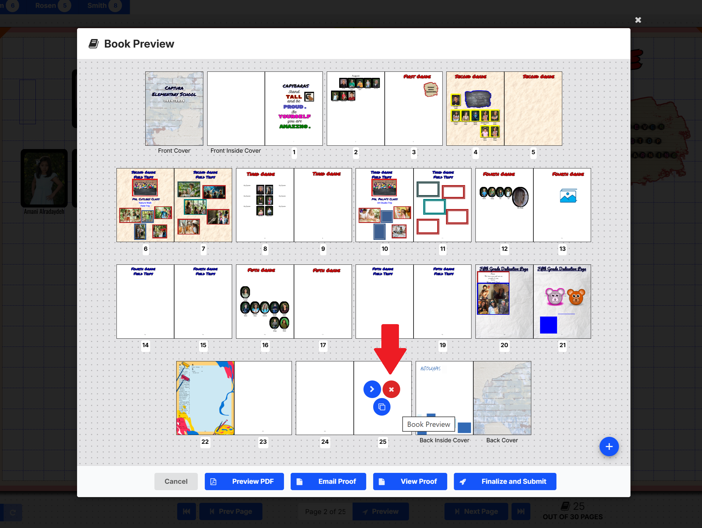 If you want to remove a page, hover over the page you want to remove and then click on the red x button which will appear. Clicking on the blue button next to it will go to that page. You can also click and drag the page to a different spot. The only pages you can't change the front/back covers and inside covers. Those are locked into place. If you have a class that covers more than one page, all of those pages will also be moved or removed together.