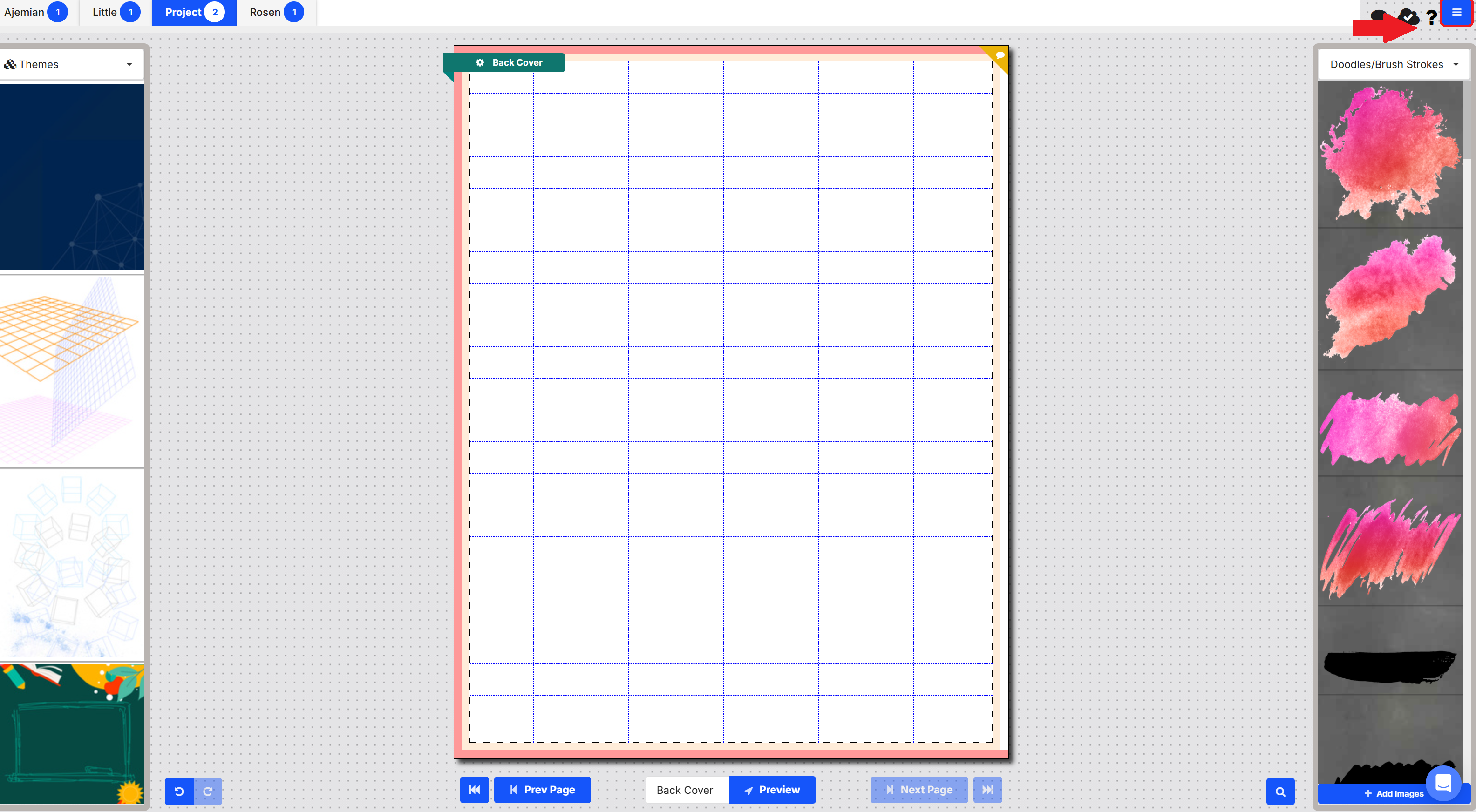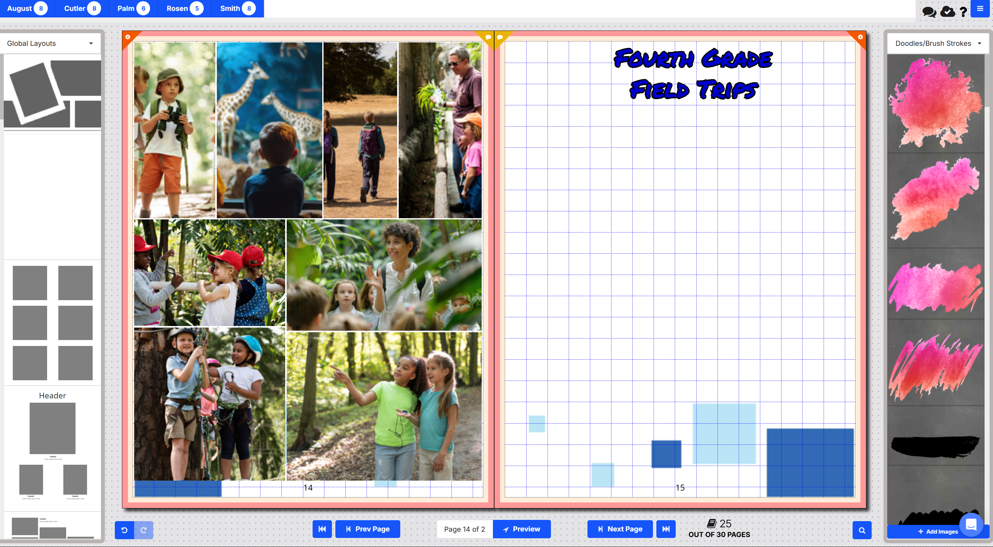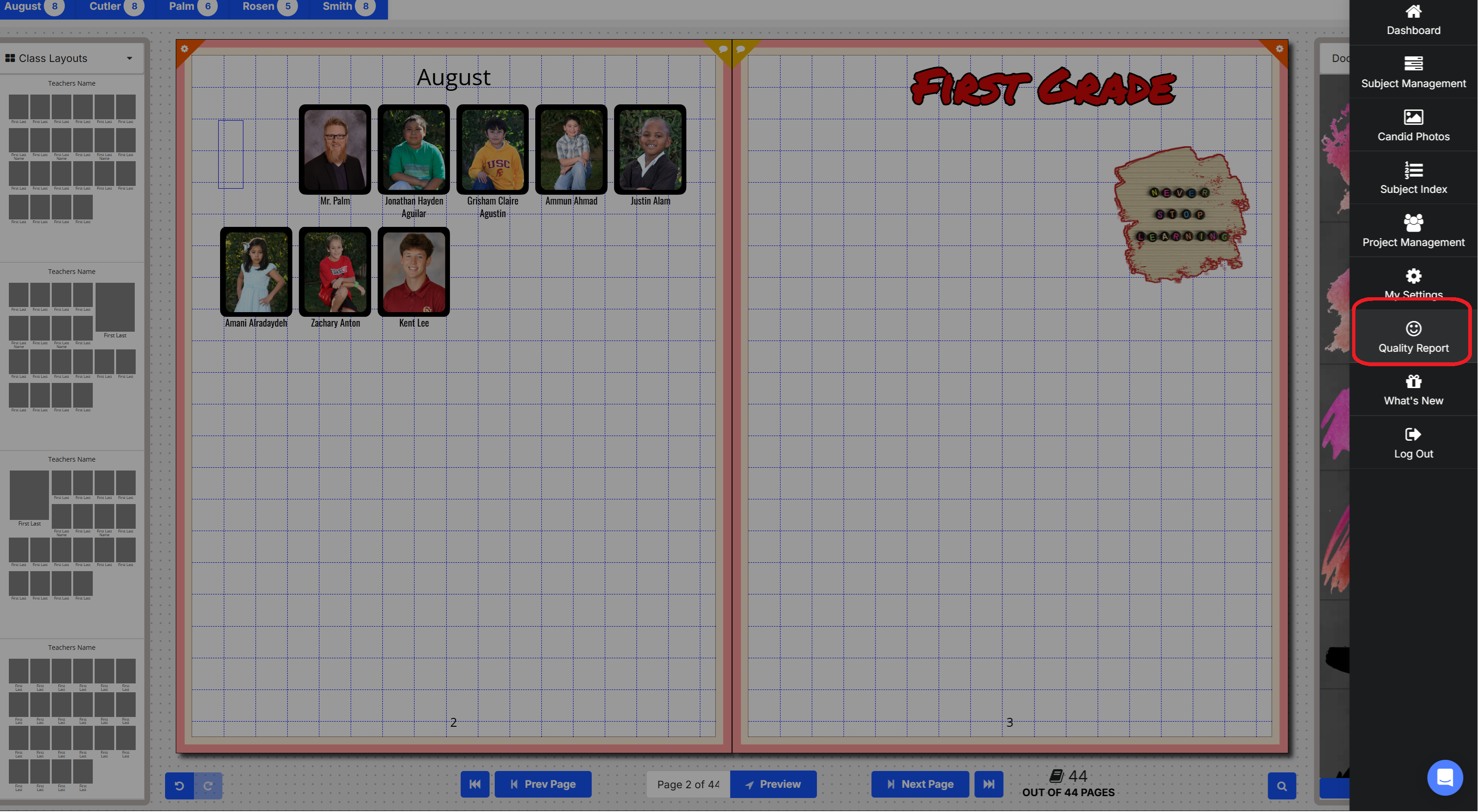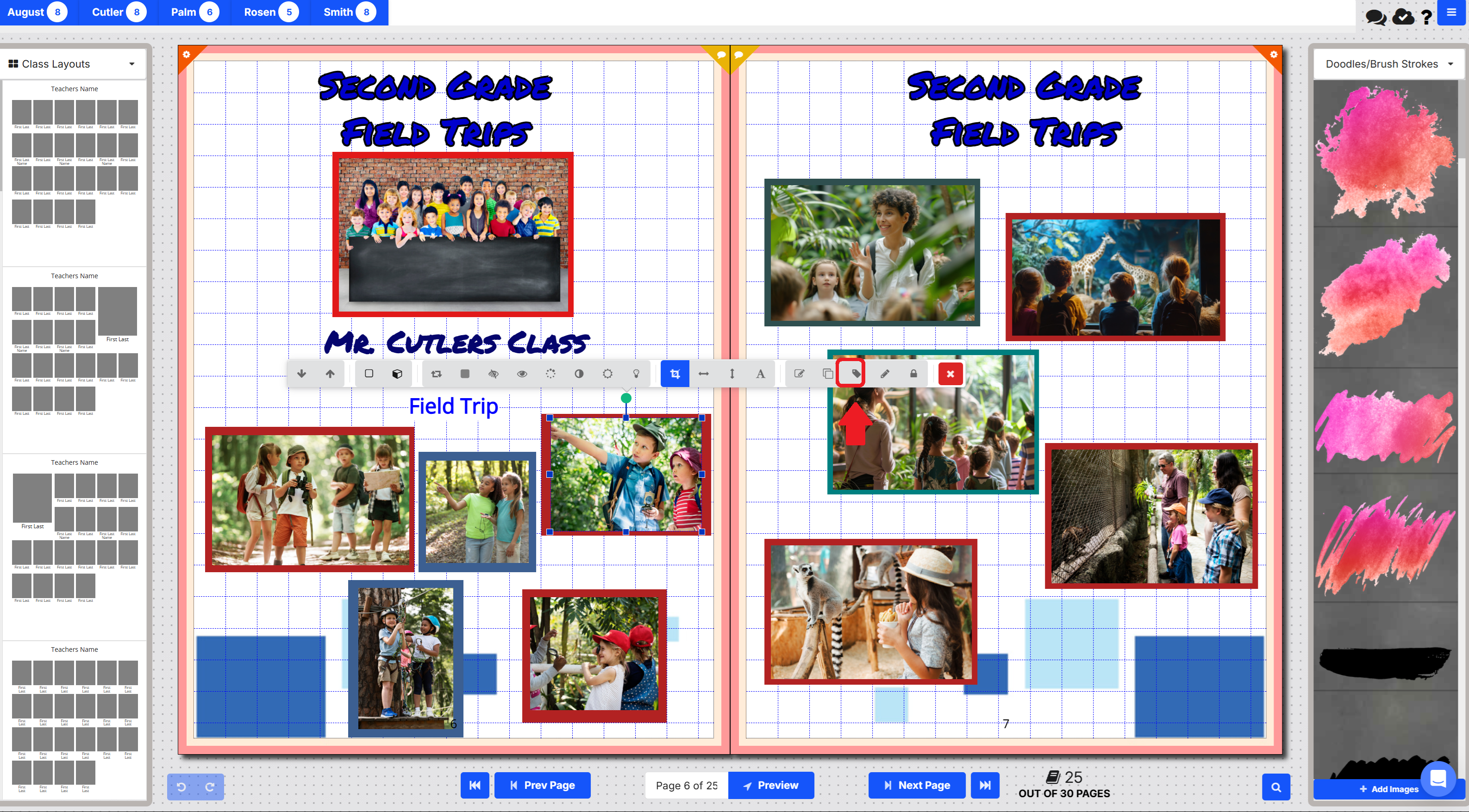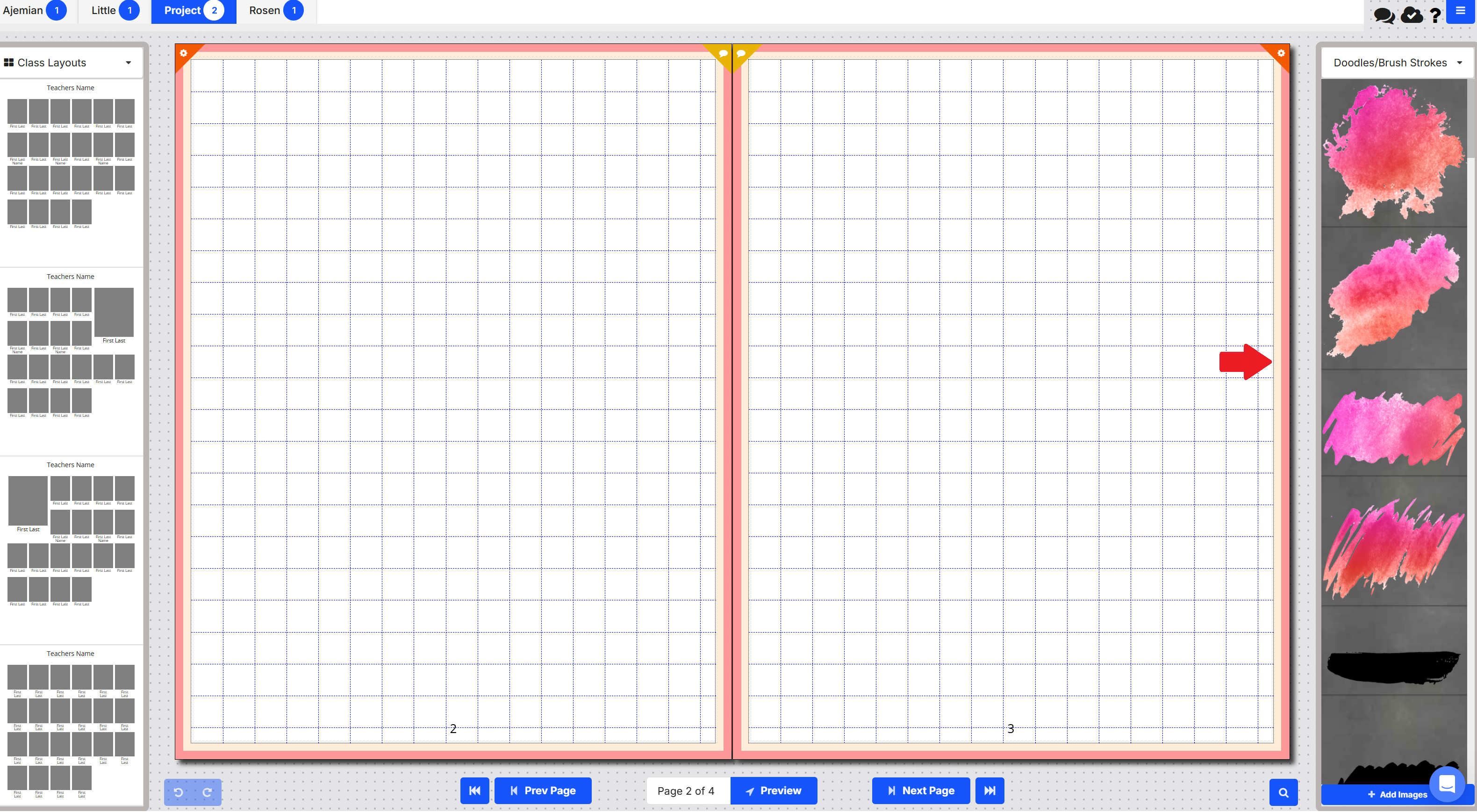 If you want to remove a page, hover over the page you want to remove and then click on the red x button which will appear. Clicking on the blue button next to it will go to that page. You can also click and drag the page to a different spot. The only pages you can't change the front/back covers and inside covers. Those are locked into place. If you have a class that covers more than one page, all of those pages will also be moved or removed together.