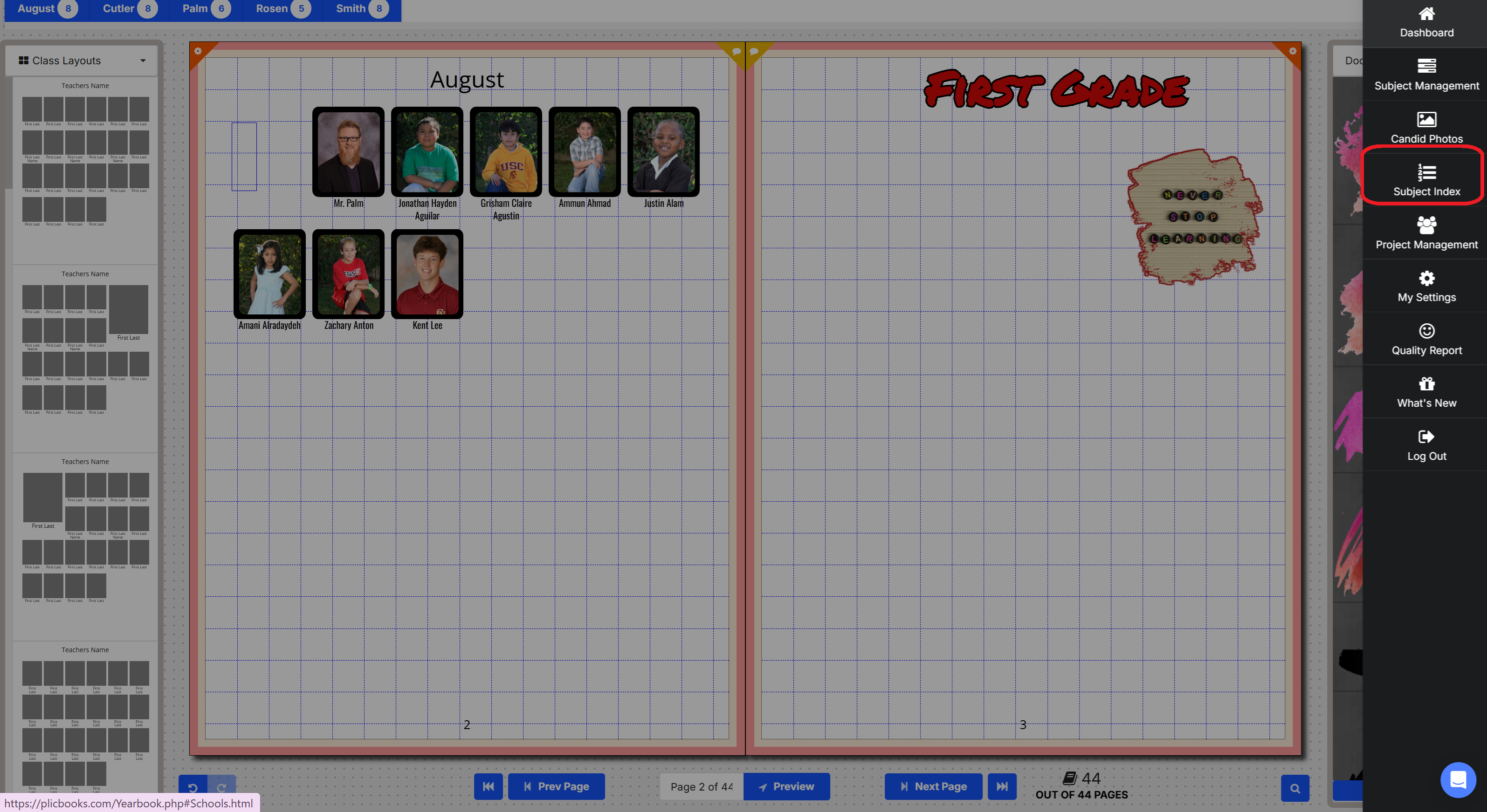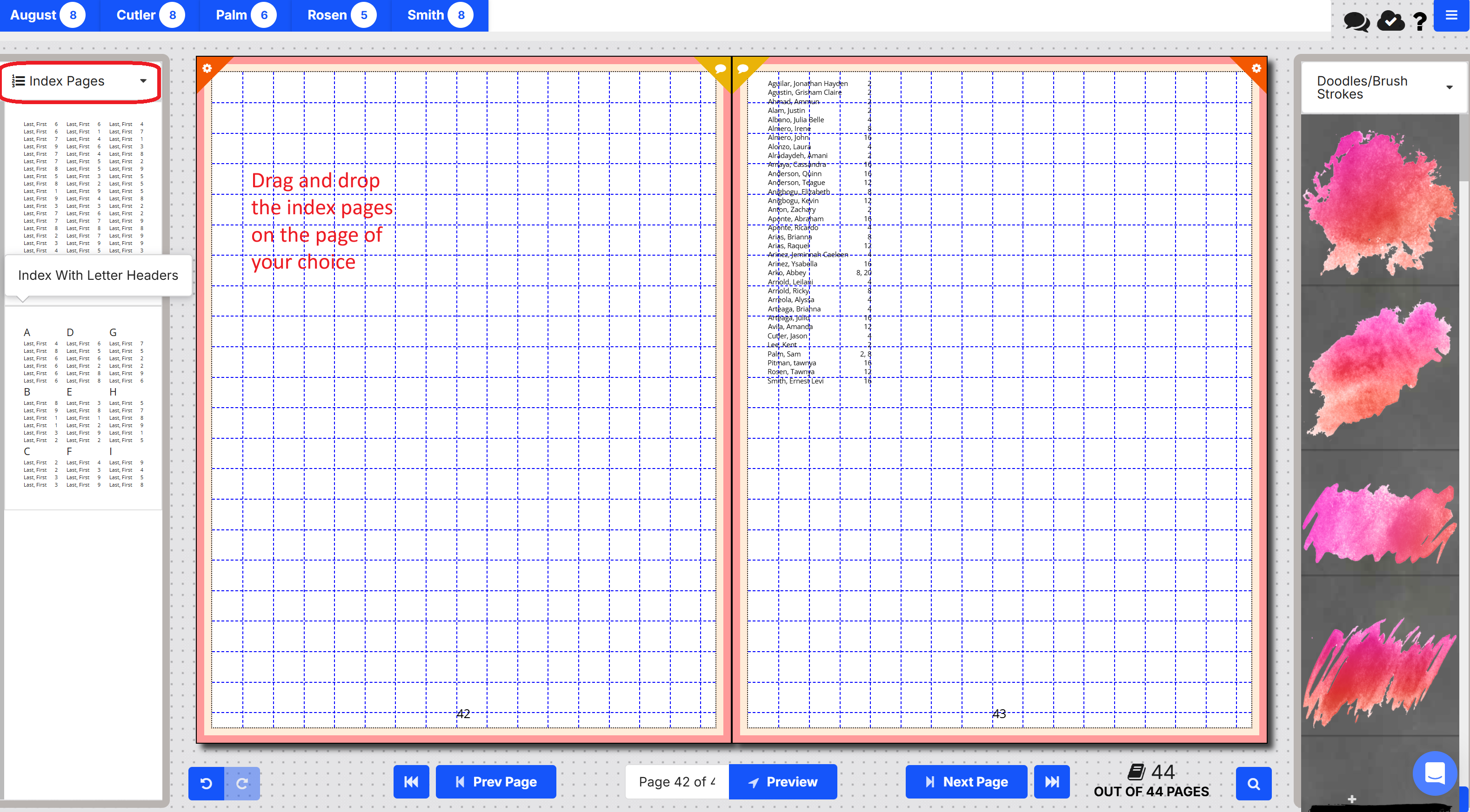 From the left sidebar, one of the categories is called Index Pages. You can drag one of these layouts onto the page in order to create a special index page. This index page will include a list of every subject in the Book, and what page they are on. If subjects are tagged in candid images, this index will include those as well.