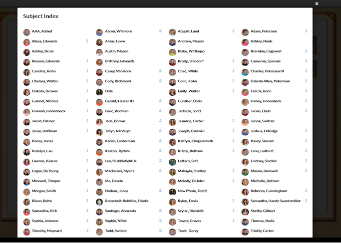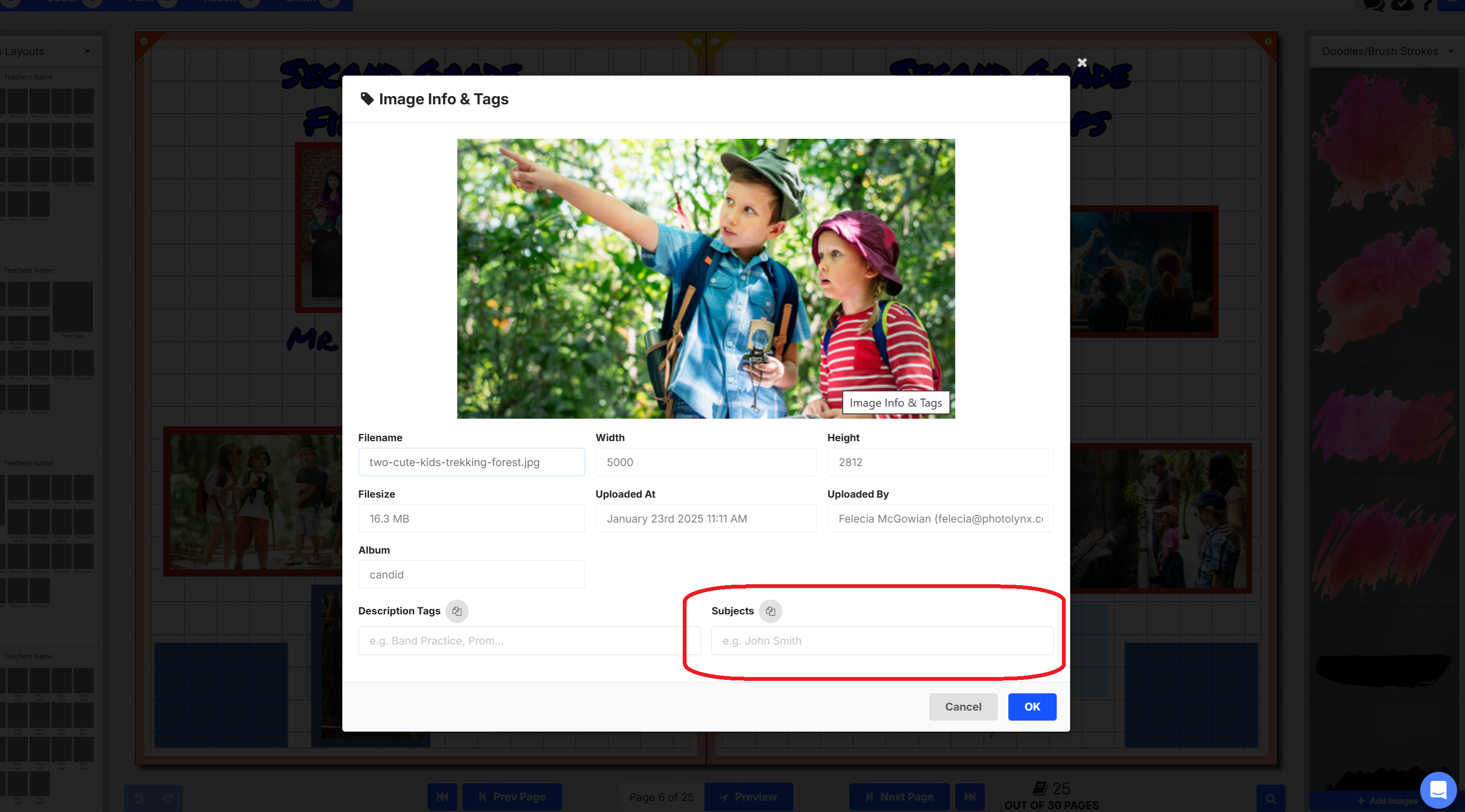 Now you will see a dropdown with all of the available subjects to tag. Select all of the subjects in that image, then click OK to save. Now you can better track who is placed in the Book and where. These subjects will now show up as tagged in candid images in the index if you place an index page in your Book.