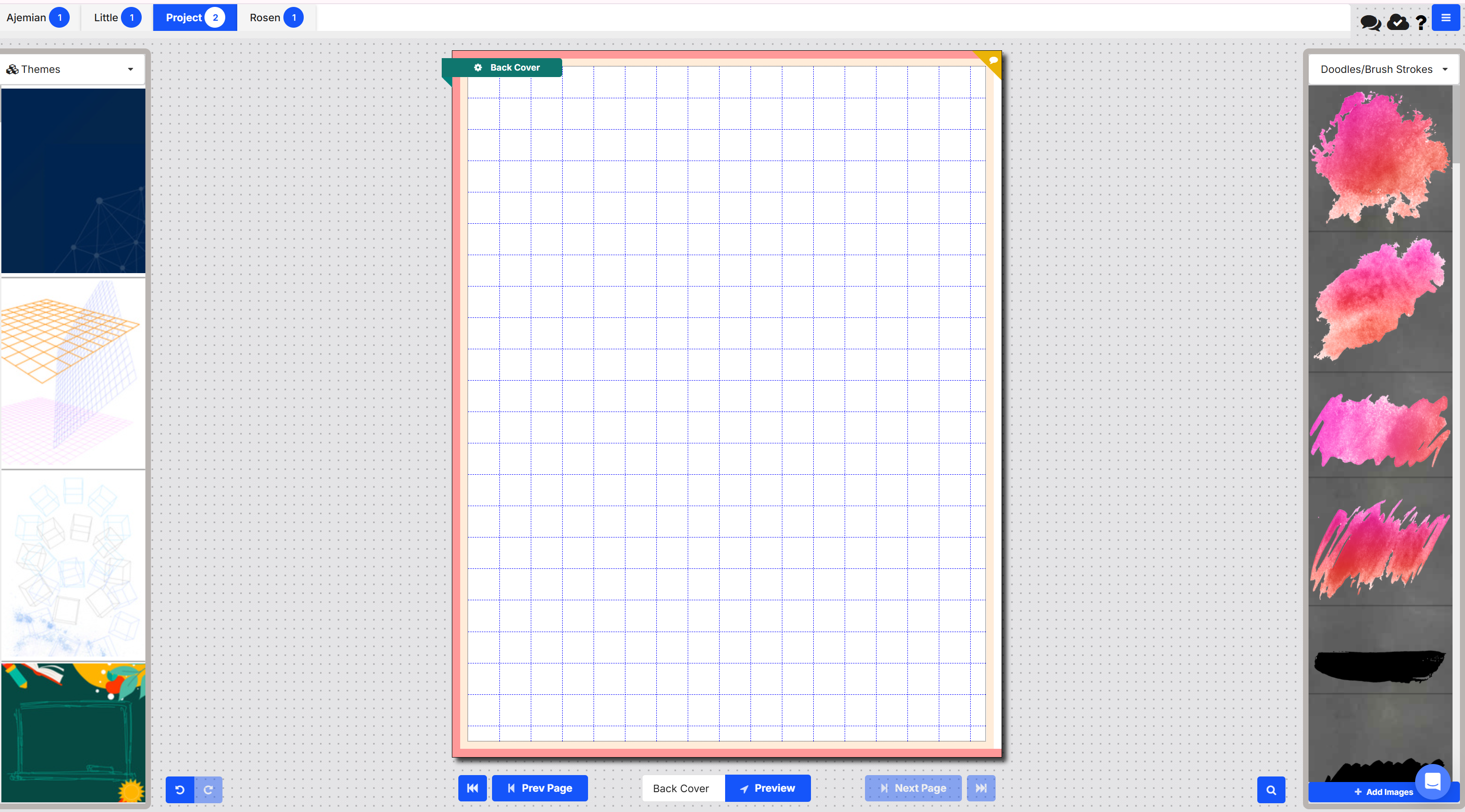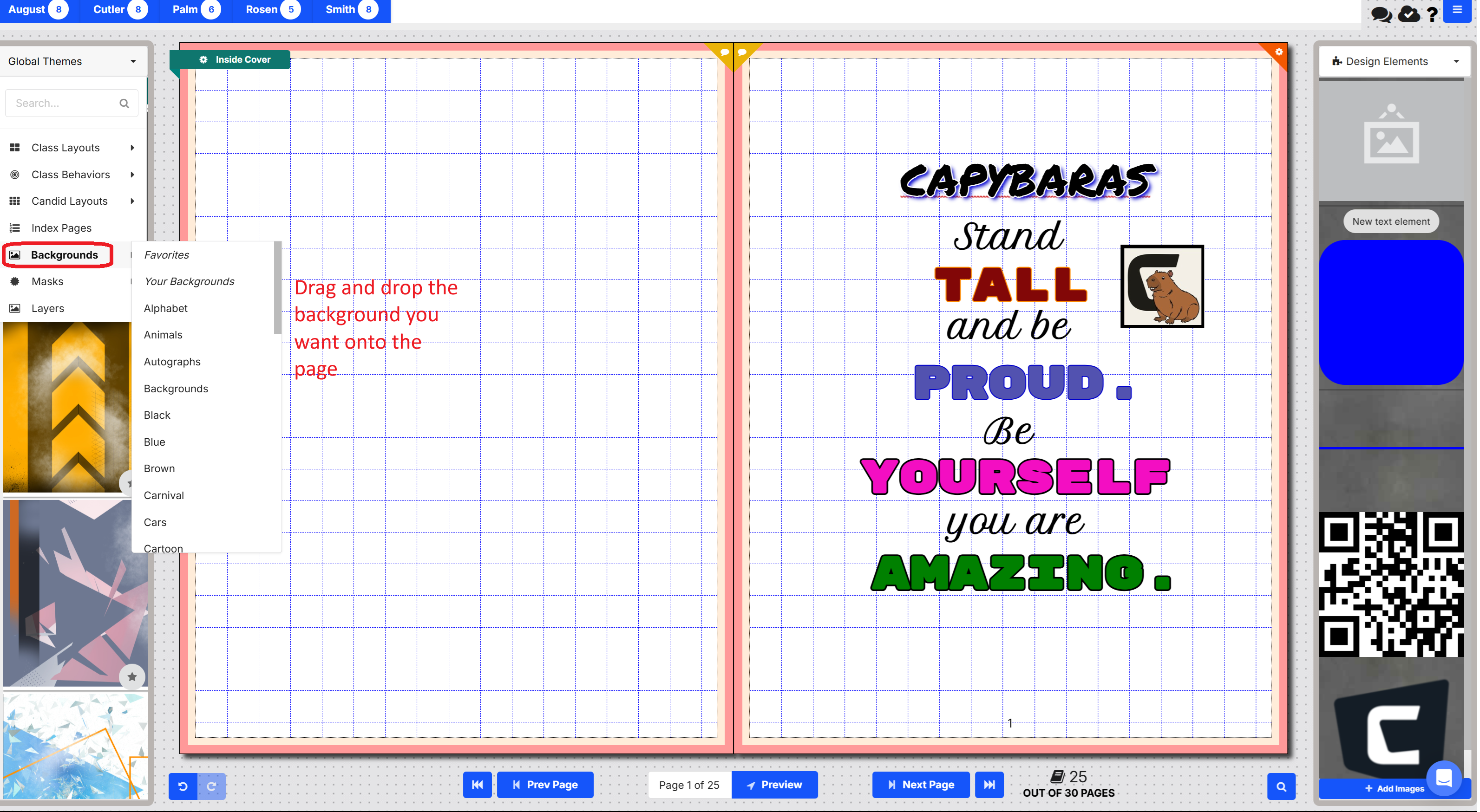If you want to control your backgrounds on a page per page basis, go into the Backgrounds section on the left sidebar. There are a wide variety of backgrounds for you to choose from built into the system. If you want to bring your own background in to use, open up the Backgrounds section and click on Your Backgrounds. At the bottom there is a button called "Add Backgrounds" which you can use to upload as many backgrounds as you wish. After they are uploaded, you can drag them over onto each page.