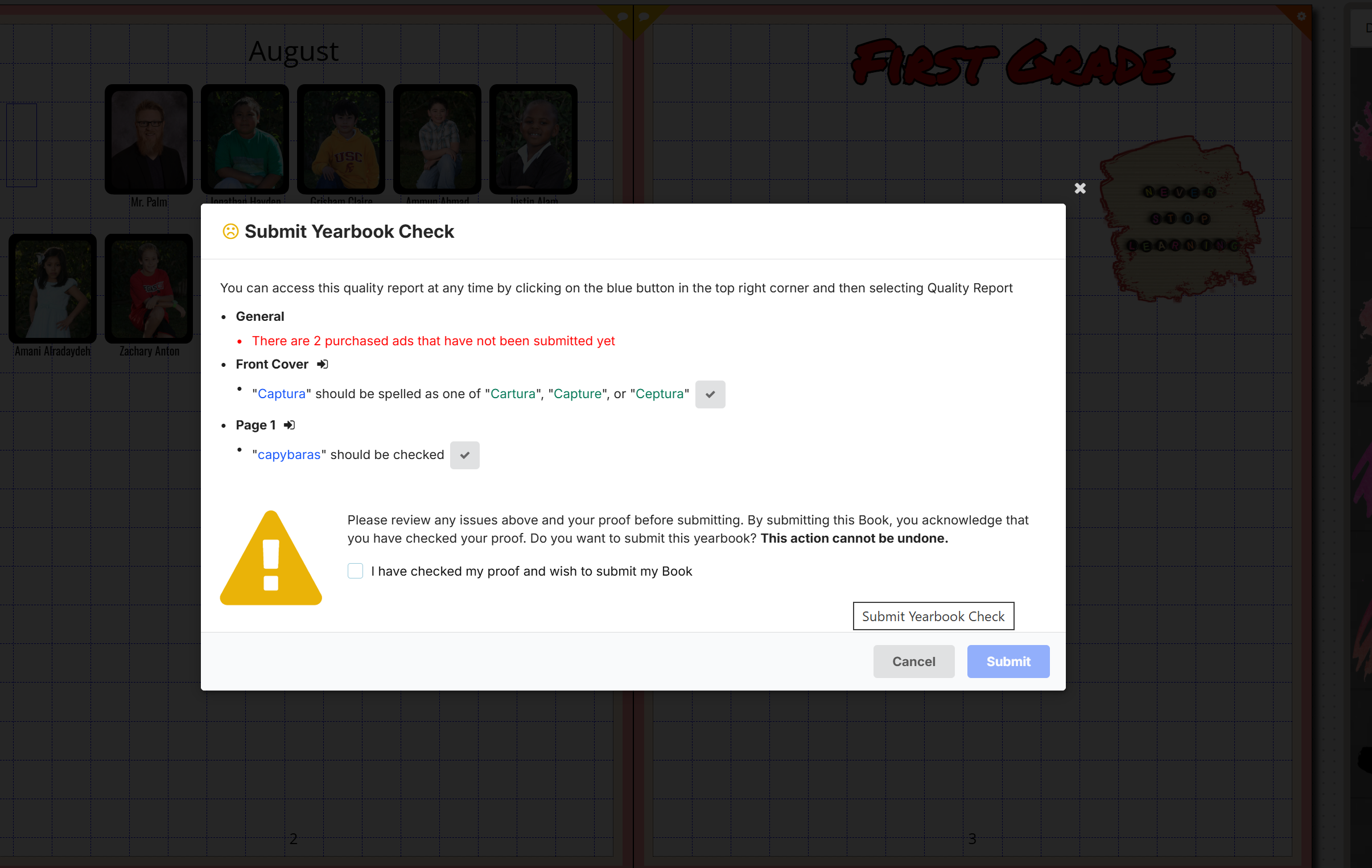 This will open up a quality report about your Book design. In here, we will list any possible issues we can find. Some general issues it will check for are which batches haven't been placed in the Book yet, low resolution photos, and any naughty words a user might be trying to sneak in. Please note that these are superficial checks only and do not replace QAing your Book!