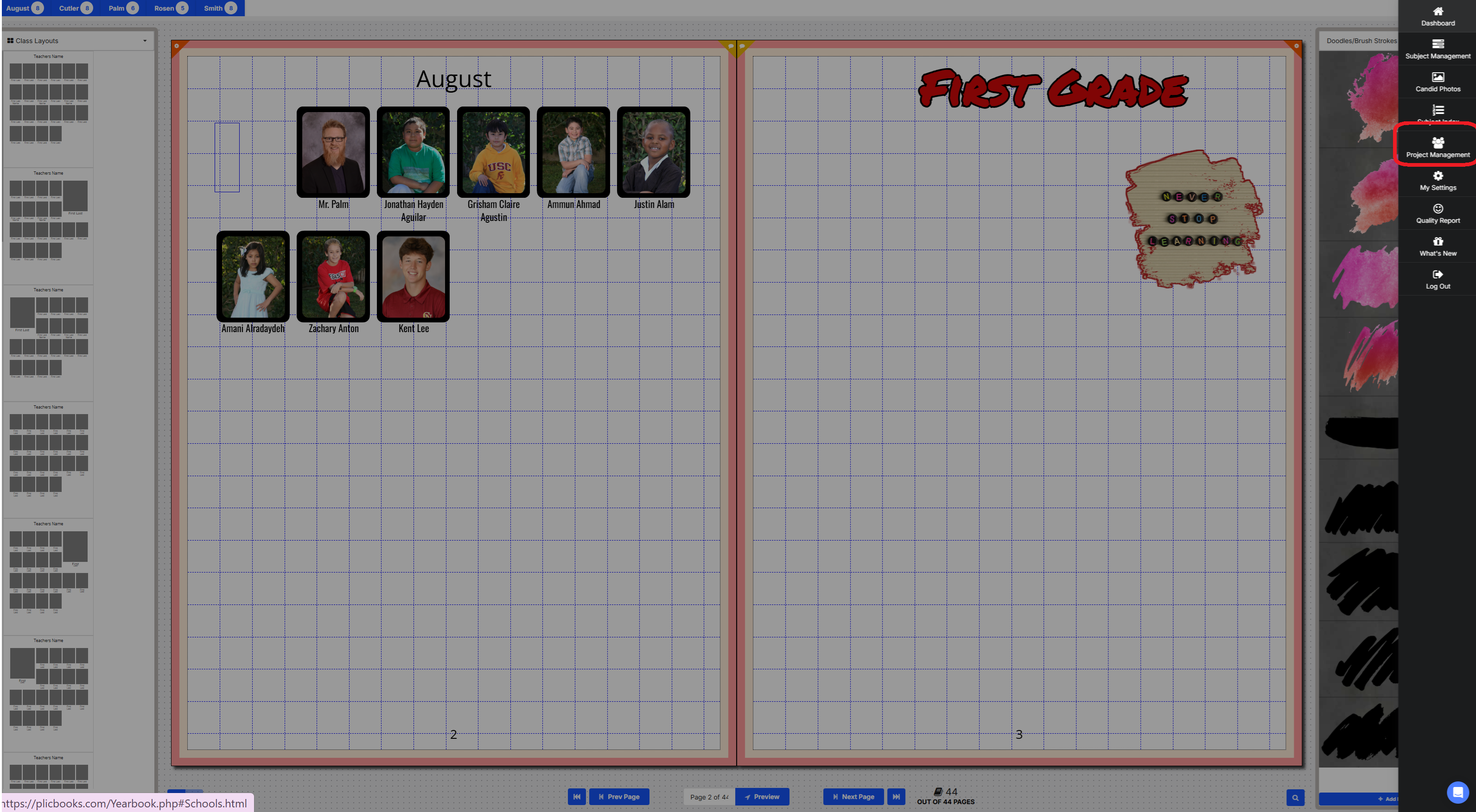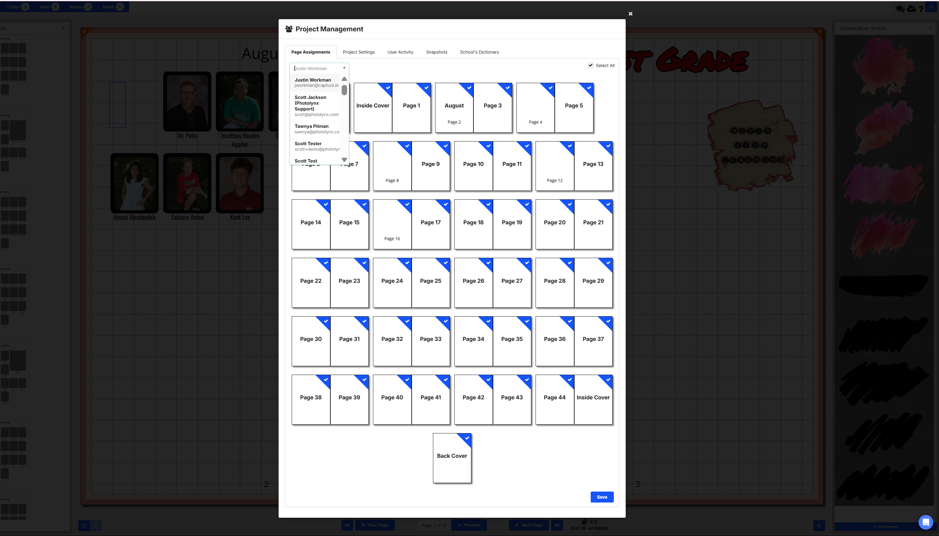 Here some additional tools will be available. The first tab is Page Assignments, which allows you to set other users to only be able to view/edit certain pages. This is particularly useful when you have a yearbook class helping to design your Book.