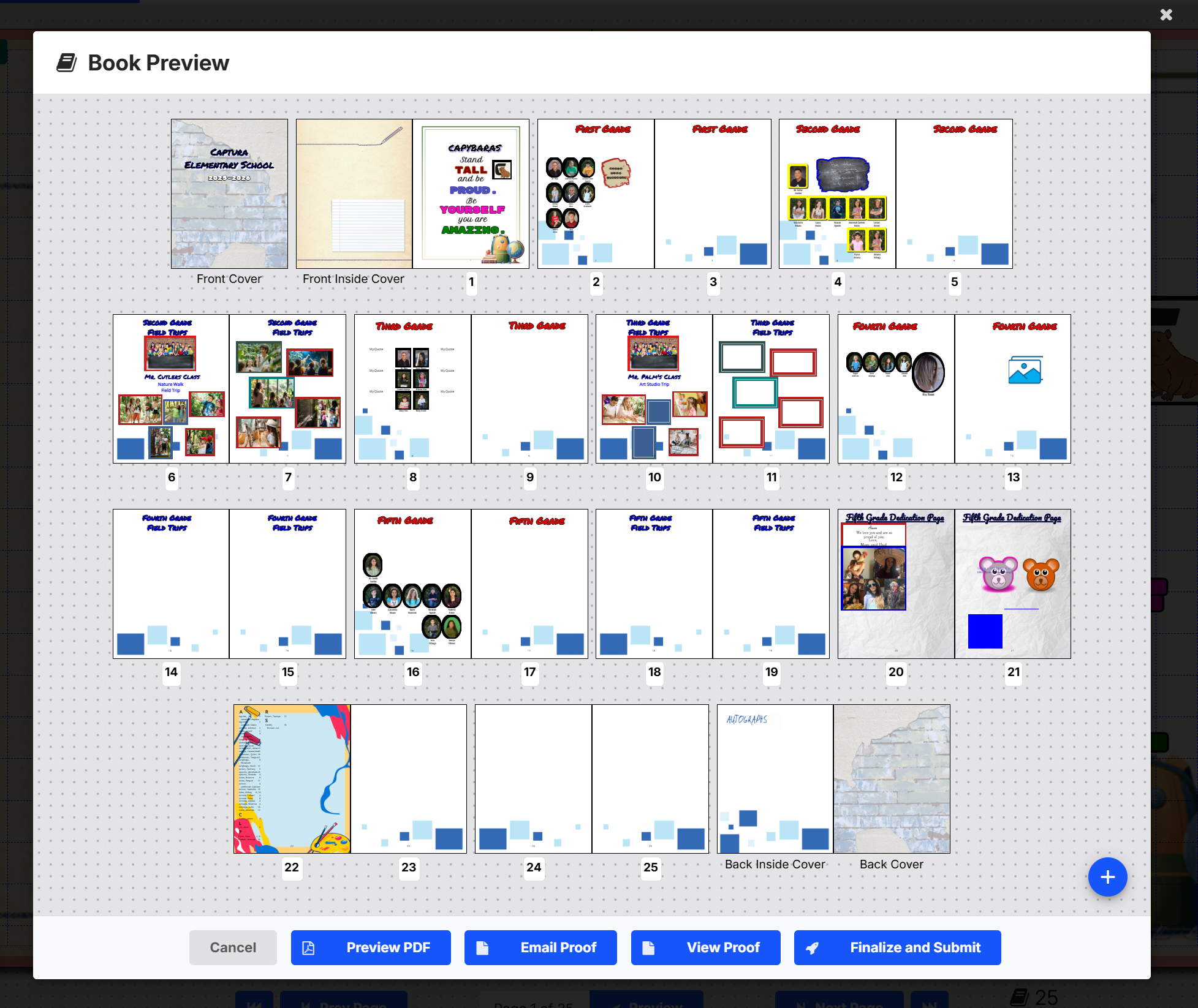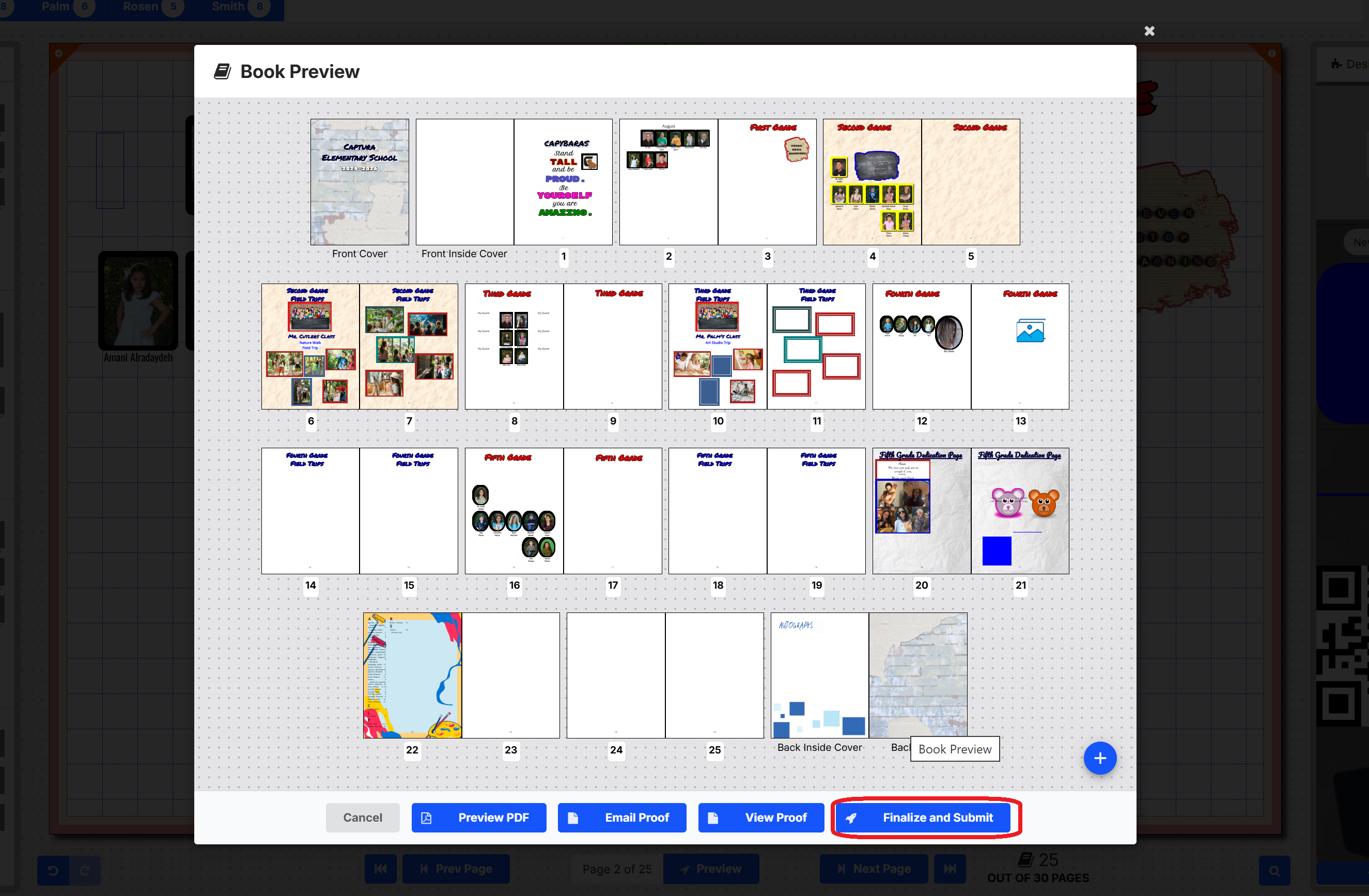 Think you are ready to submit your Book? Click on the Preview button at the bottom of your screen. This will open a preview of your Book for you to look over. Before you submit your Book, you should generate a proof by clicking on the blue Generate Proof button. This will render out a proof PDF and email you a link to check it out. After you are satisfied with the results, you can click on Finalize and Submit. This will lock you out of the Book and email your studio that you are all done and ready for the Book to be printed. Once you do this, you will NOT be able to make any other changes without contacting the studio.