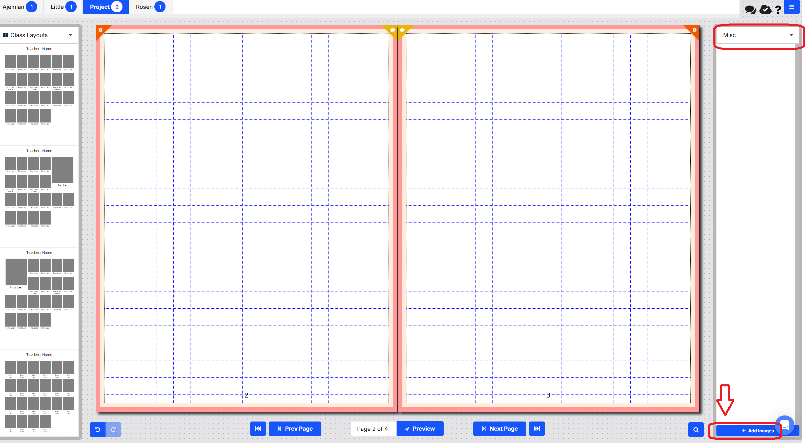 Next, you probably want to start adding some candid images into the system so you can actually start designing your pages. When you click on the album dropdown on the right hand side, you will by default see a Misc album underneath the Clip Art menu option. You can click on Create Album to create as many albums as you need to organize things. For now, click on the Misc album. You should see an empty sidebar. Next, click on the Add Images button at the bottom to get started. An uploader will pop up which you can use to upload some candid photos.