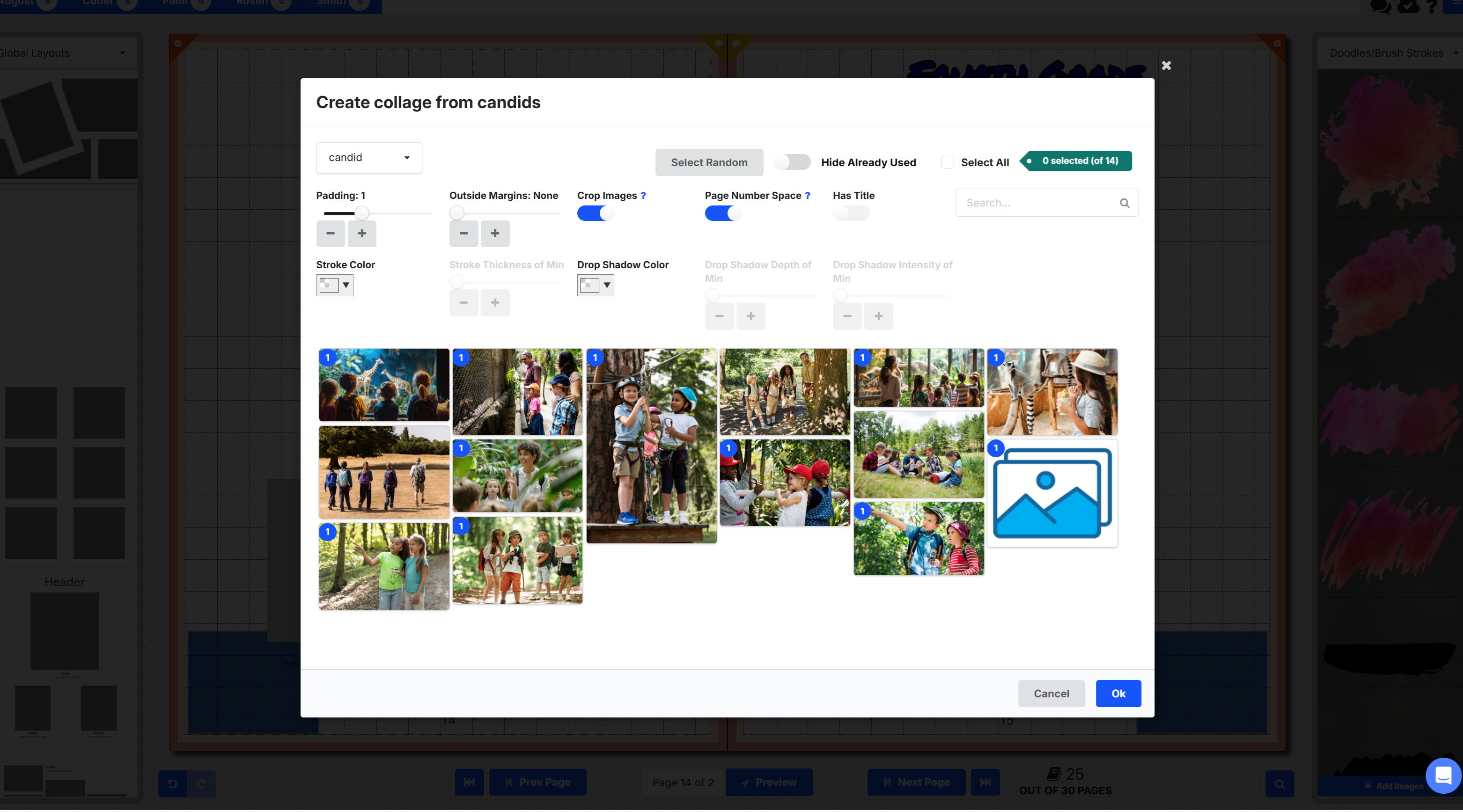The top layout in the Global Layouts section is an auto collage builder. After you drag the collage layout onto a page, you will see a screen where you can select which images you want to build the collage with. You can choose to pad between the images and margins on the outside of the layout. Click on the images you want to be included in the collage, or click Select Random to pick a random group of them.