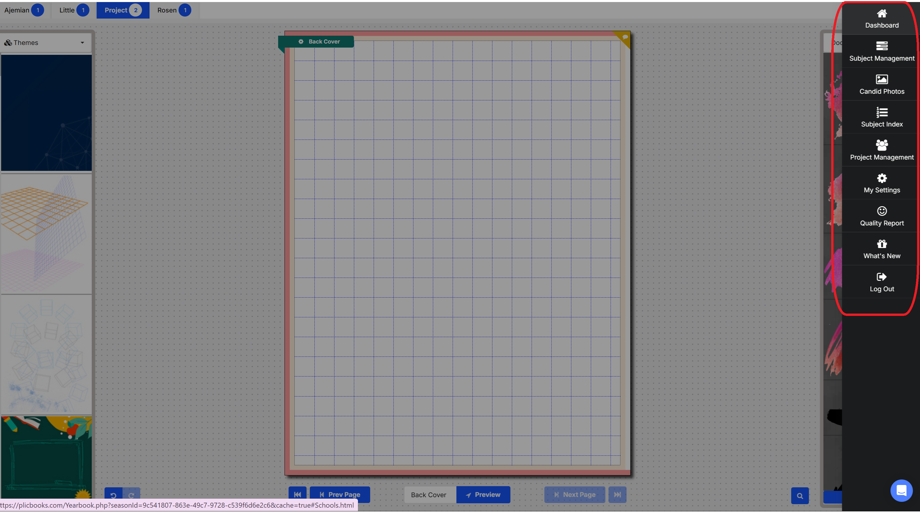 The main part of the designer is made up of the left sidebar, book design area, and the right sidebar. The left sidebar has options such as Themes, Layouts, Backgrounds, Masks, and Page Behaviors. The center design area is where you will work on your book. When you first open the project only the front cover will be showing. As you advance through the Book, you will see the left and right pages side by side to work on. The right sidebar is where images can be found. Here you will access our global list of clip art, and any candid images you have uploaded to use in your Book.