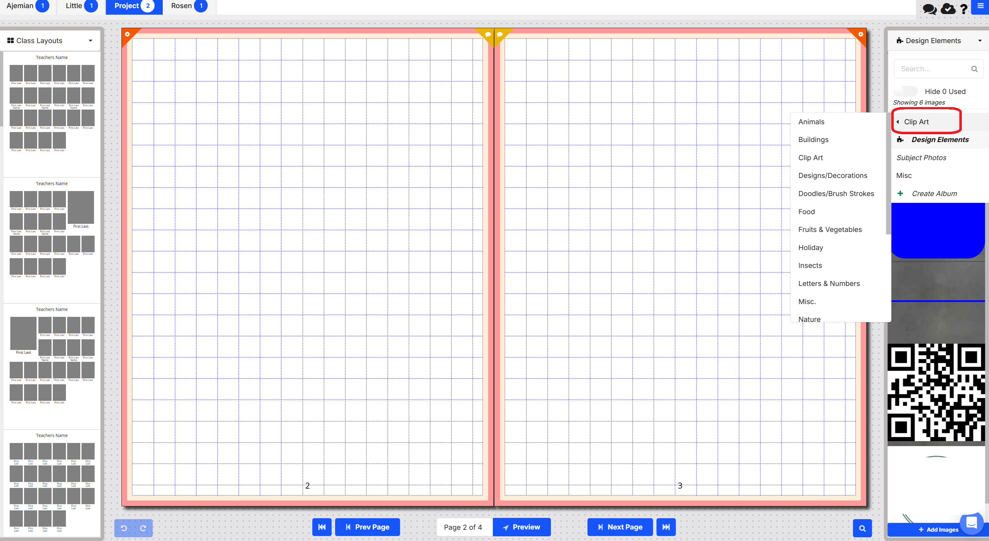 Try dragging one of the clip art from the right sidebar onto a page to get started. Next, you can click and drag it where ever you want it to be on the page. If you want to see options for that image node, click on it to bring up its toolbar. You can change the layering of images, add a border or drop shadow, crop, remove it from the page, etc... from this toolbar.