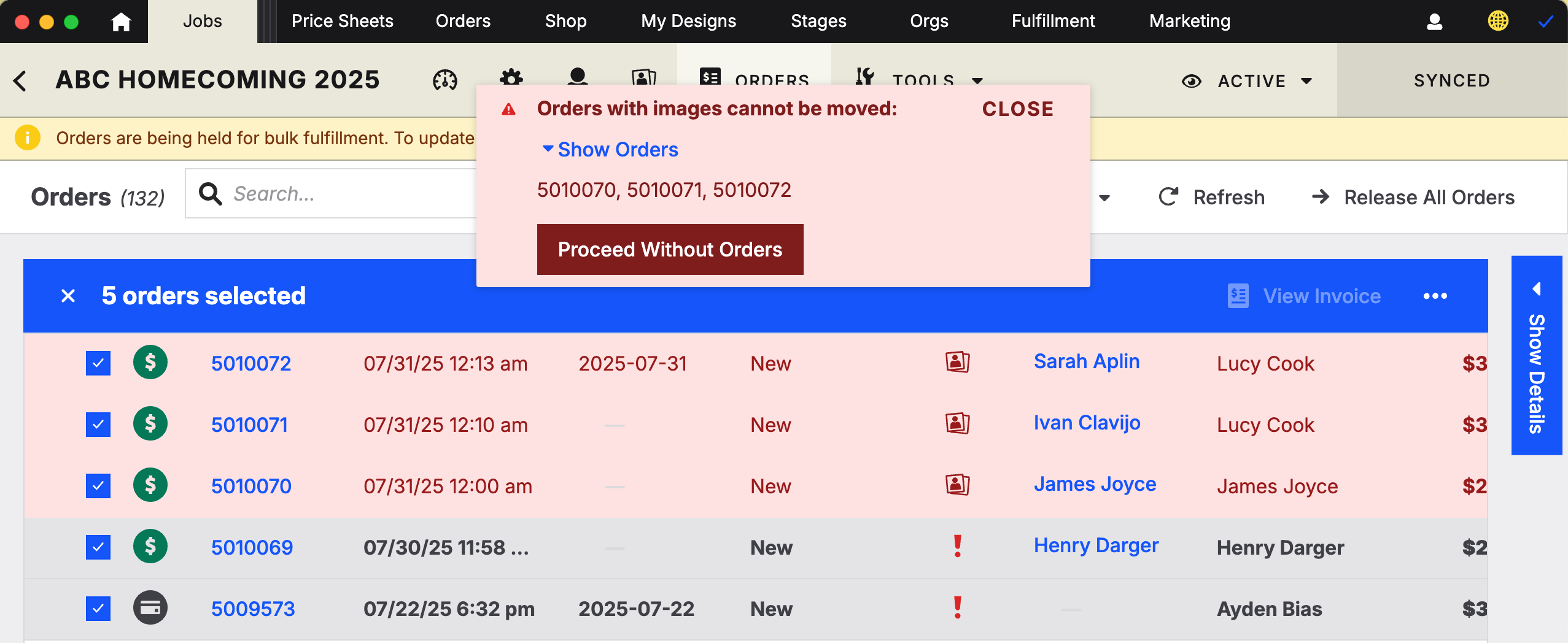 If any selected orders are invalid, you’ll see a toast warning and the invalid orders will be highlighted. Either fix the selection manually or click “Proceed Without Orders.”