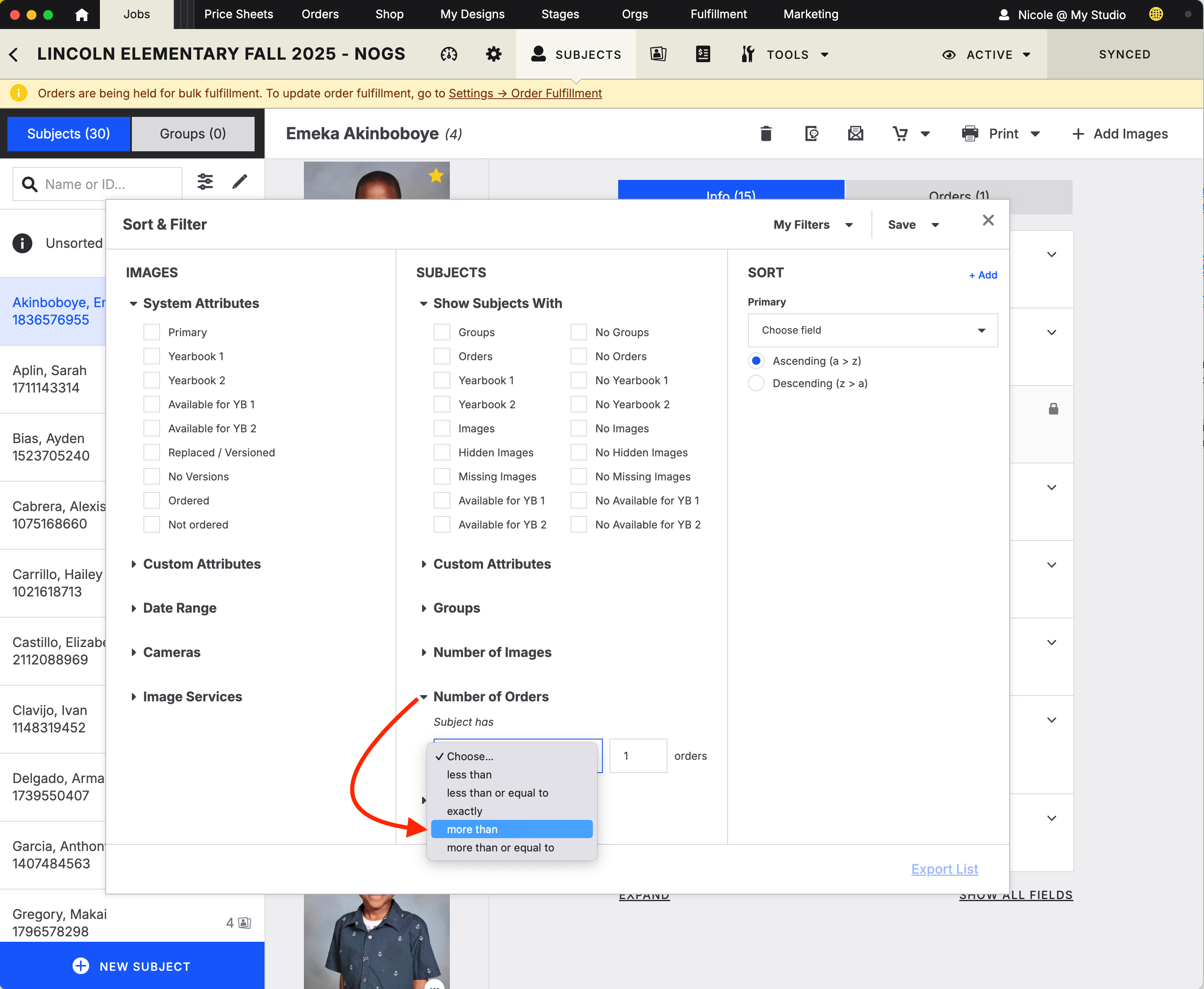 To help you spot issues faster, try using filters in the Subjects tab to filter for subjects with more than one order.