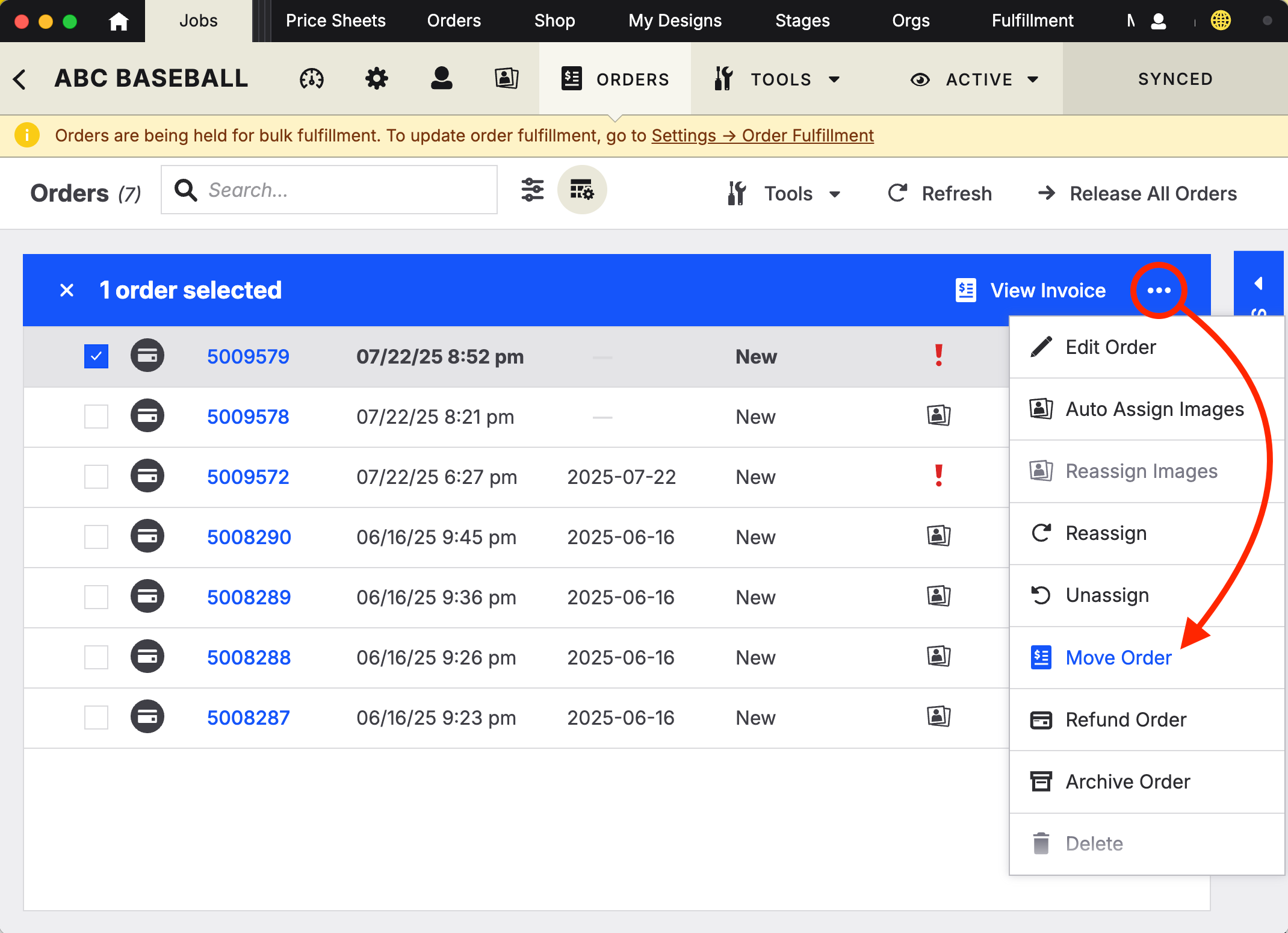 Only users with the Job Orders: Add/Edit/Delete permission can move orders. If you don’t see the option, check with your admin