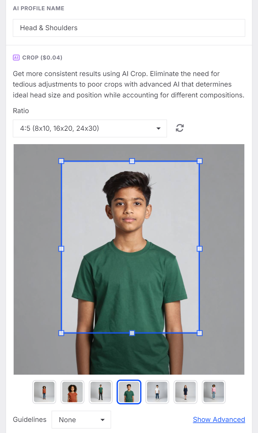 To get the most consistent results, create separate crop profiles for each subject and pose type. When configuring the crop, choose the preview image that most closely matches the pose you’re working with.